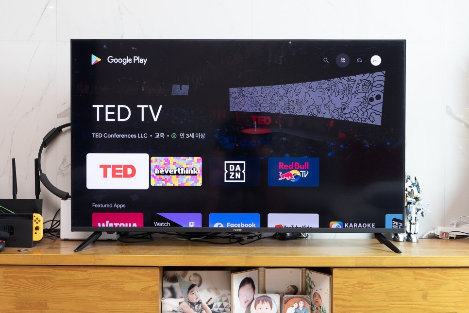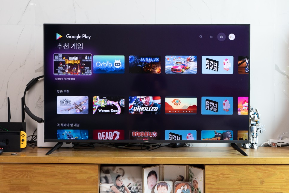 안드로이드 TV의 가장 큰 장점은 스마트폰처럼 구글 플레이를 이용하여 다양한 앱, 게임 등을 설치할 수 있다는 것입니다. 그동안 스마트TV는 제조사에서 자체 제작한 호환 가능한 제한적인 앱을 제공했지만, 포스픽TV는 직접 구글 플레이를 통해 넷플릭스, 유튜브, 와처 등 3000여 종의 많은 앱을 사용할 수 있습니다. 단, TV용 안드로이드(9.0 버전)이기 때문에 모바일 앱을 모두 지원하는 것은 아닙니다. 이건 모든 안드로이드 TV가 똑같아요.