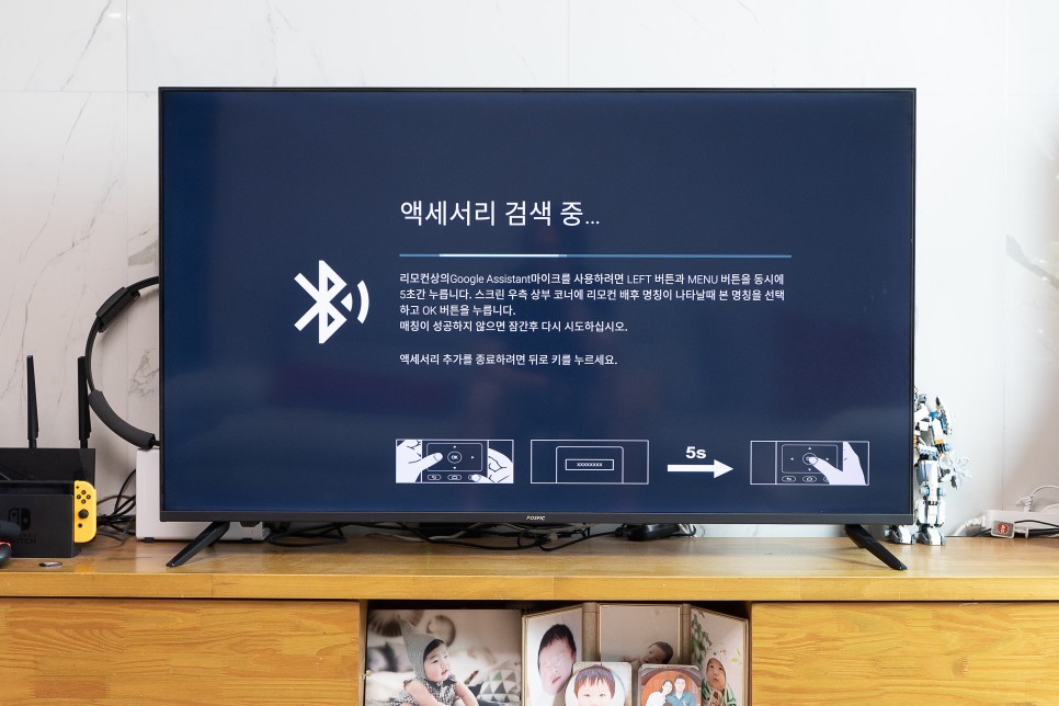 그리고 블루투스 지원으로 무선 키보드, 무선 마우스, 블루투스 이어폰, 조이스틱 등 최대 5개까지 연결 가능합니다. 리모컨으로 입력할 수도 있지만 이렇게 키보드와 무선마우스를 연결하면 정말 큰 화면의 태블릿을 사용하는 것과 비슷합니다.